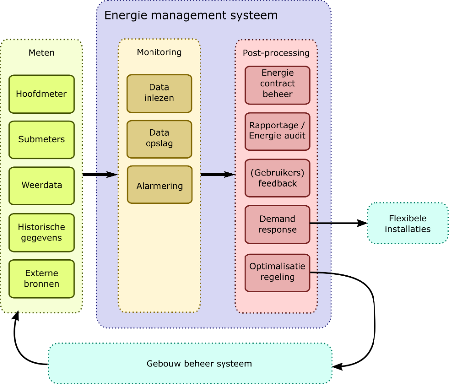 - Het energiemanagementsysteem (EMS) verzamelt energiedata uit het gebouw, slaat deze op, analyseert ze, toont de data in dashboards en geeft waarschuwingen als je grenswaarden overschrijdt. Ook helpt het EMS om de energievraag en het energie-aanbod slim op elkaar af te stemmen (demand response) en regelingen te optimaliseren.
